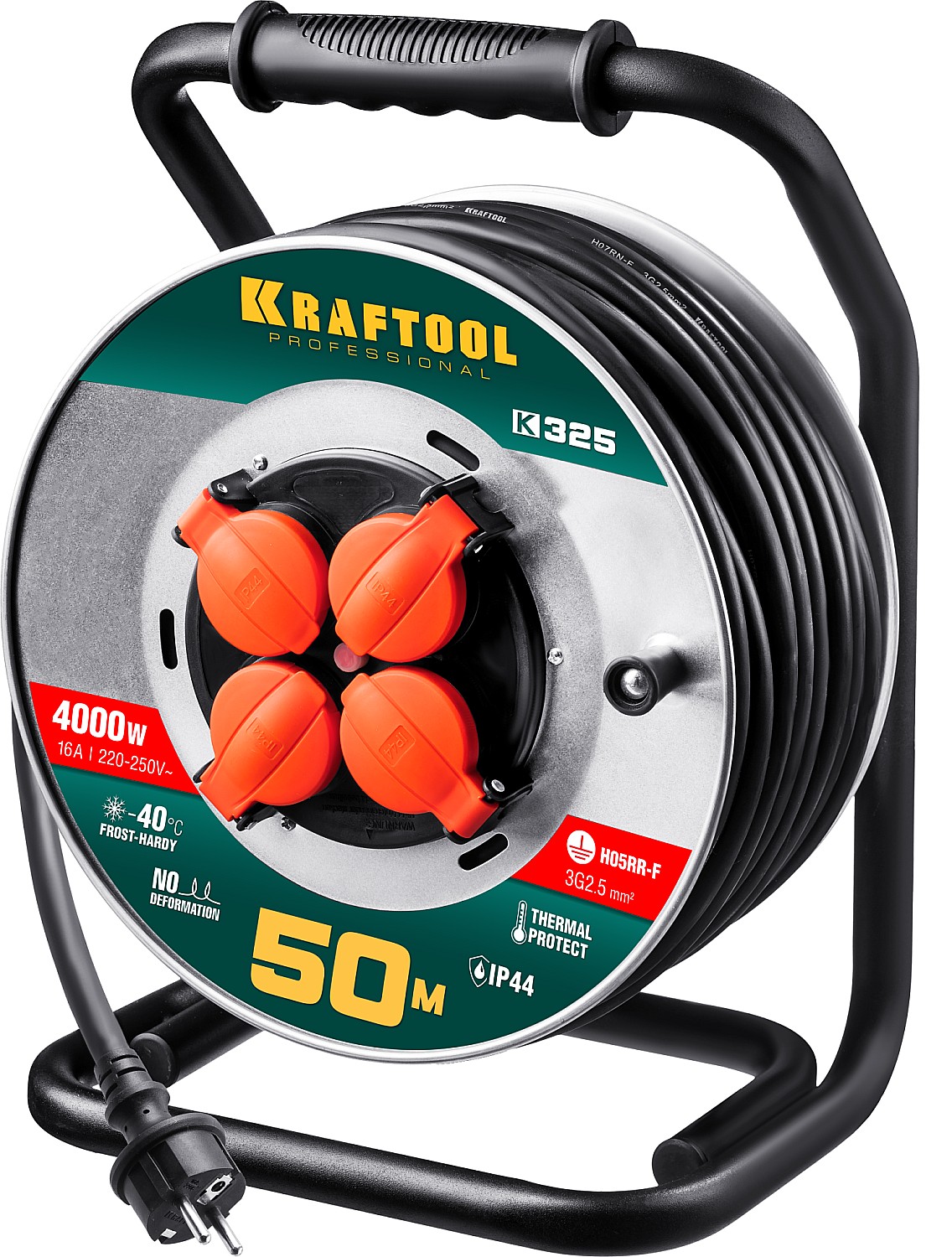KRAFTOOL 50 м, 4000 Вт, 4 гнезда, IP44, КГ 3x2,5 кв мм, удлинитель на катушке 55086-50