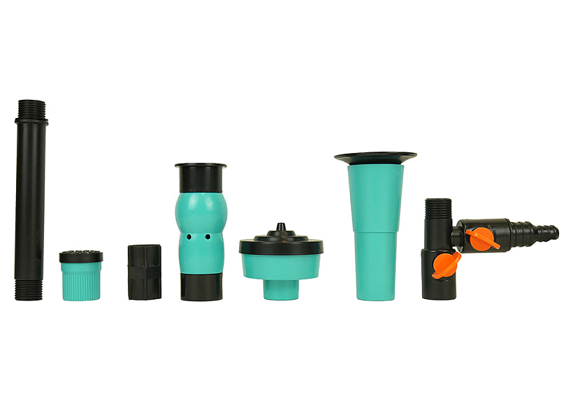 Четыре насадки в комплекте с разной формой струи: гейзер, колокольчик, большой и малый каскад.