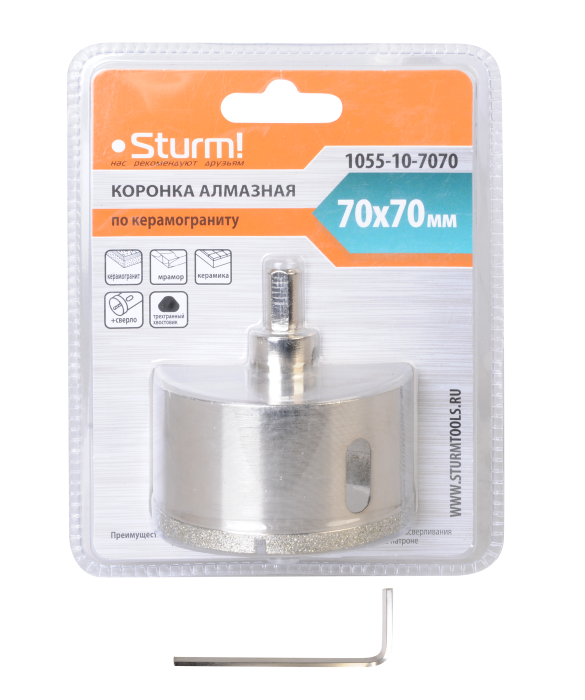 Особенности : -Оптимальная концентрация алмазов и зернистость #46 обеспечивают ровный рез без сколов -Центрирующее сверло в комплекте для точного позиционирования и удобного засверливания -Хвостовик с проточками предотвращает прокручивание в патроне |Обрабатываемый материал : Керамогранит, керамическая плитка |Диаметр (мм) : 70 |Тип хвостовика : С проточками |Тип реза : Мокрый |Тип реза : Мокрый |Артикул : 1055-10-7070 |Производитель : Sturm! |Диаметр (мм) : 70 |Тип хвостовика : С проточками |Обрабатываемый материал : Керамогранит, керамическая плитка |Вид упаковки : Блистер |Габариты в упаковке (ДхШхВ, см) : 15x11,5x7 |Основной штрихкод : 4603010103325 |