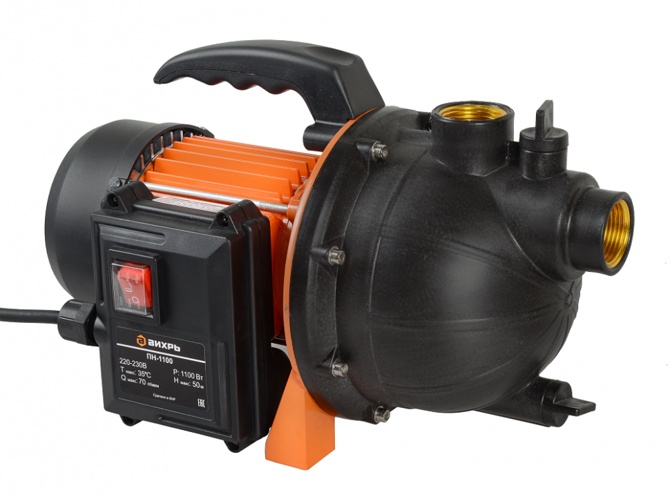 Поверхностный насос самовсасывающего типа Вихрь ПН-1100 обеспечивает водоснабжение в загородных домах из колодцев, скважин, открытых водоемов и производит локальное откачивание жидкости. Мощность двигателя 1100 Вт позволяет использовать его для полива приусадебного участка. Насос способен всасывать воду с глубины до 9 м и поднимать ее на расстояние 50 м. При этом сохраняется максимальная производительность 70 л/мин. Возможное количество твердых примесей в воде составляет 150 г/м³.Перед началом работы необходимо к отверстиям прикрепить штуцеры для шланга диаметром 1 дюйм и закрепить их хомутами. Затем шланг от входного отверстия следует опустить в емкость с чистой водой, а шланг выходного отверстия - в пустой резервуар. Заполнив водой всасывающую магистраль через заливное отверстие, можно приступать к перекачиванию жидкости.Поверхностный насос Вихрь ПН-1100 удобен в эксплуатации. Корпус из прочного пластика обеспечивает малый вес конструкции. Рукоятка в верхней части облегчает транспортировку. Удобные ножки у основания обеспечивают стабильное положение на любой поверхности. Степень защиты IPX4 предотвращает попадание в рабочие узлы влаги и пыли, позволяет размещать насос в помещениях с повышенной влажностью.