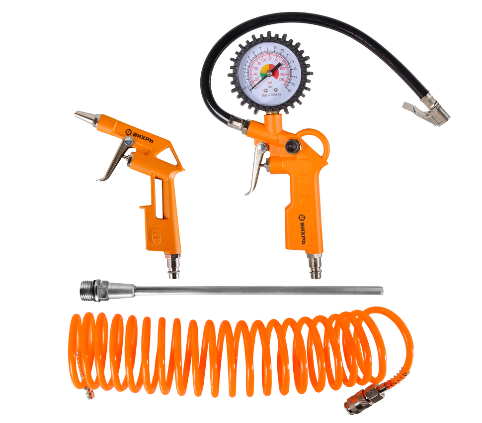 Набор пневмоинструмента ВИХРЬ НП-4 – это оборудование, которое работает от компрессора с помощью энергии сжатого воздуха. Все пневмоинструменты снабжены быстросъёмными штуцерами.В комплект входит: Пистолет для продувки, Пистолет для накачки шин, Спиральный шланг, Насадка удлинитель пистолета для продувки (19 см).Каждый инструмент работает при определенном рабочем давлении (см. инструкцию по эксплуатации).
