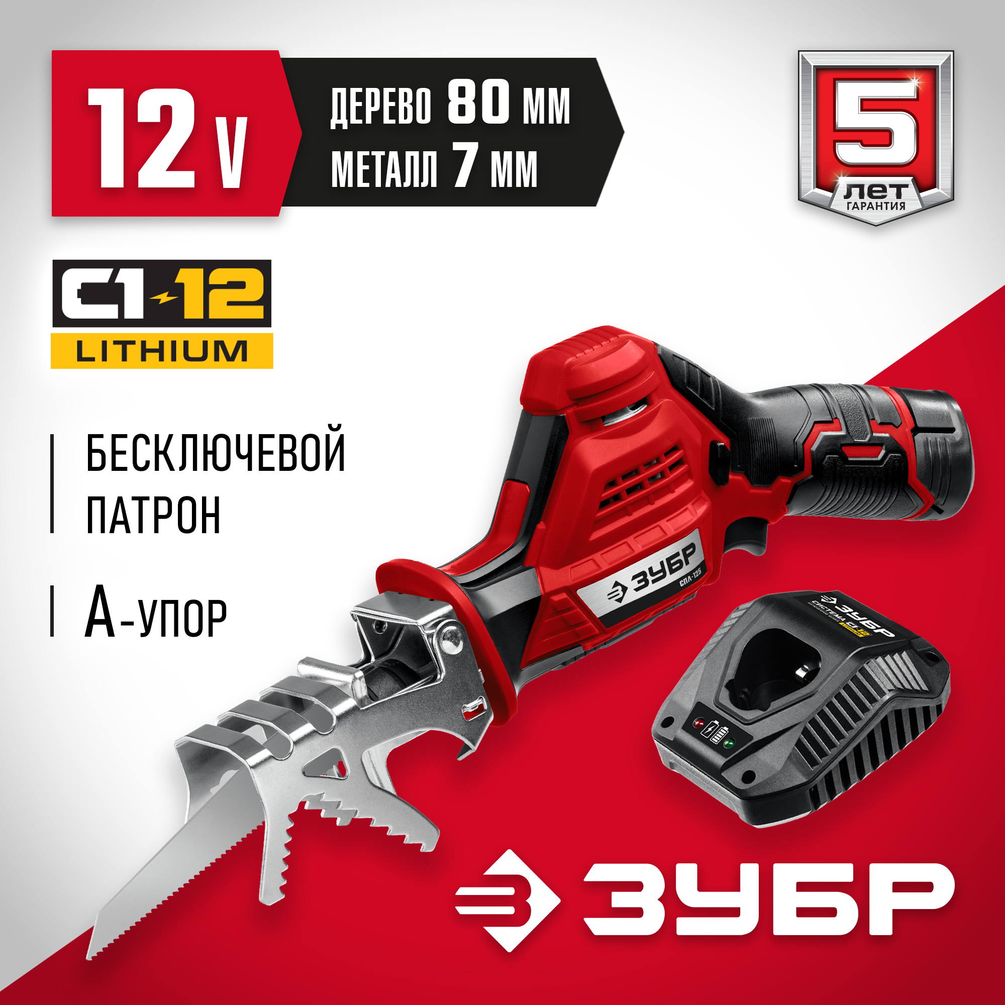 ЗУБР 12В, 1 АКБ (2Ач), в коробке, пила сабельная СПЛ-125-21 Мастер