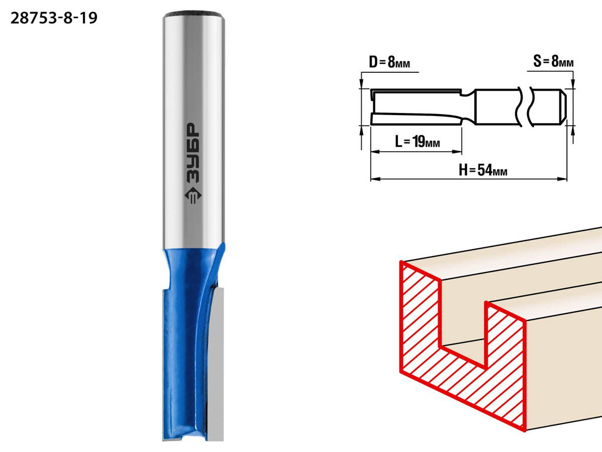 ЗУБР 8 x 19 мм, хвостовик 8 мм, фреза пазовая прямая 28753-8-19 Профессионал