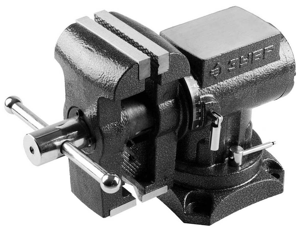 Тиски поворотные слесарные ЗУБР 32712-125, применяются для закрепления деталей при выполнении различного вида слесарных работ. Корпус и подвижная планка изготовлены из высококачественного чугуна. Цилиндрическая форма и закрытый корпус тисков обеспечивают плавный ход подвижной планки и отсутствие люфта. Сменные губки изготовлены из высококачественной инструментальной стали и закалены. На рабочую поверхность губок нанесены рифления для надежного и безопасного крепления деталей. Для закрепления труб и деталей круглой формы на корпусе тисков предусмотрены дополнительные губки. Поворотное основание позволяет перемещать корпус тисков в горизонтальной плоскости на угол от 0 до 360 градусов. Увеличенная наковальня на корпусе тисков для выполнения слесарных работ. Установка тисков на столе осуществляется при помощи винтов и гаек, для чего в основании предусмотрены отверстия.