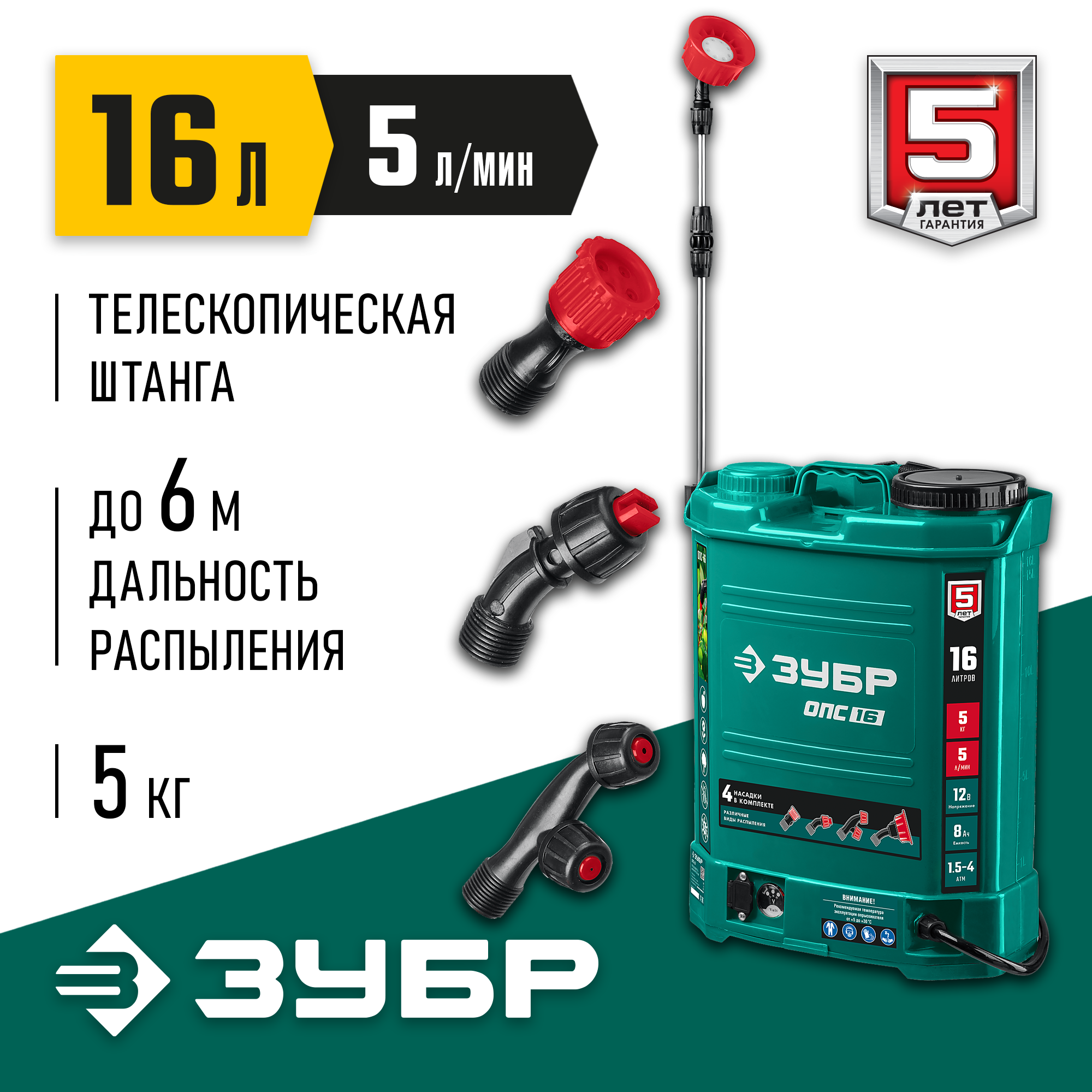 ЗУБР 12 В 400х230х510 мм, 16 л бак, опрыскиватель аккумуляторный ОПС-16 Мастер